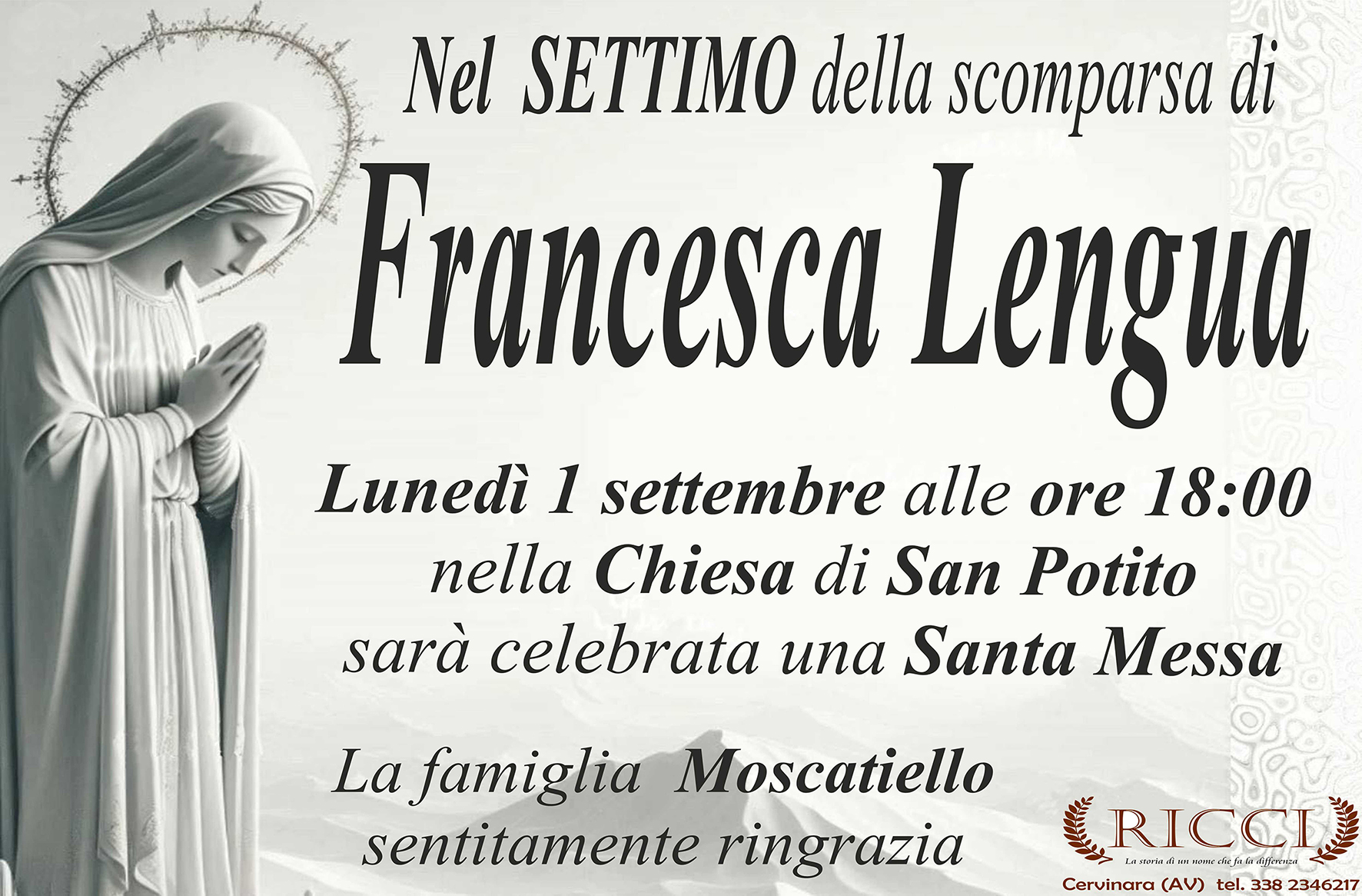 La camera ardente è allestita presso la Casa Funeraria Ricci